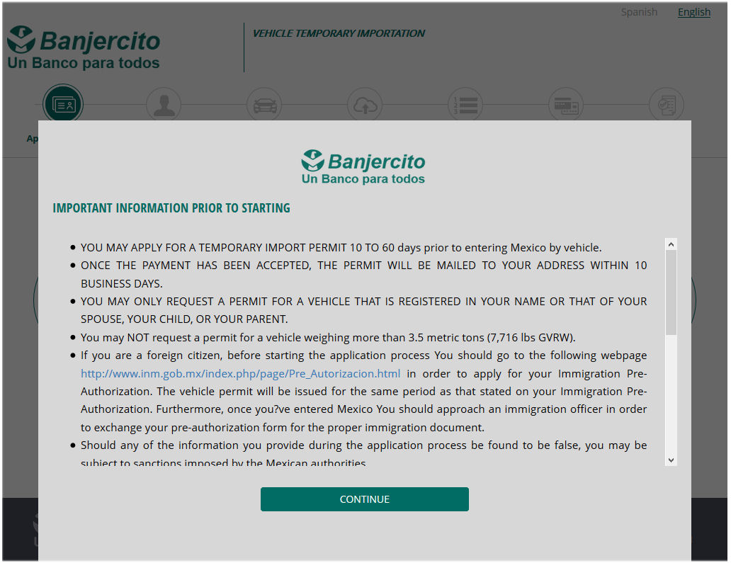 Here is an image in Spanish from Banjercito on line permit page Image 1